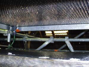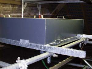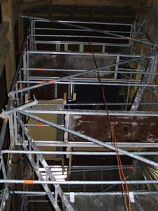 Es wurde ein ca. 10 Meter hohes Gerüst in der Scheune aufgebaut (oben).
